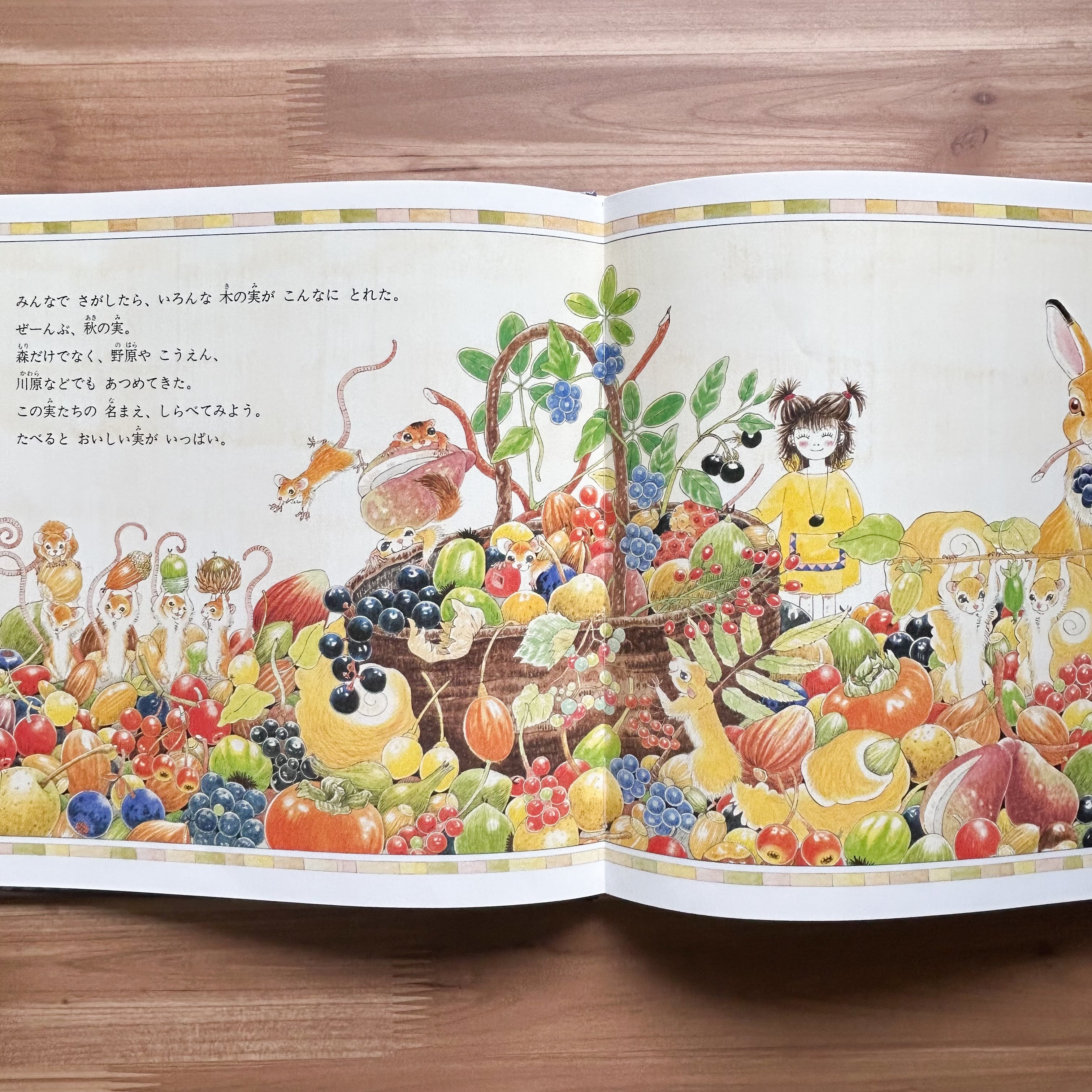 秋。山や野原や川原には、いろいろな実がなっている。赤い実、青い実、ドングリ…。動物たちといっしょに木の実を採って、観察したり、食べたり、遊んだり…。お話と図鑑がいっしょになった絵本。