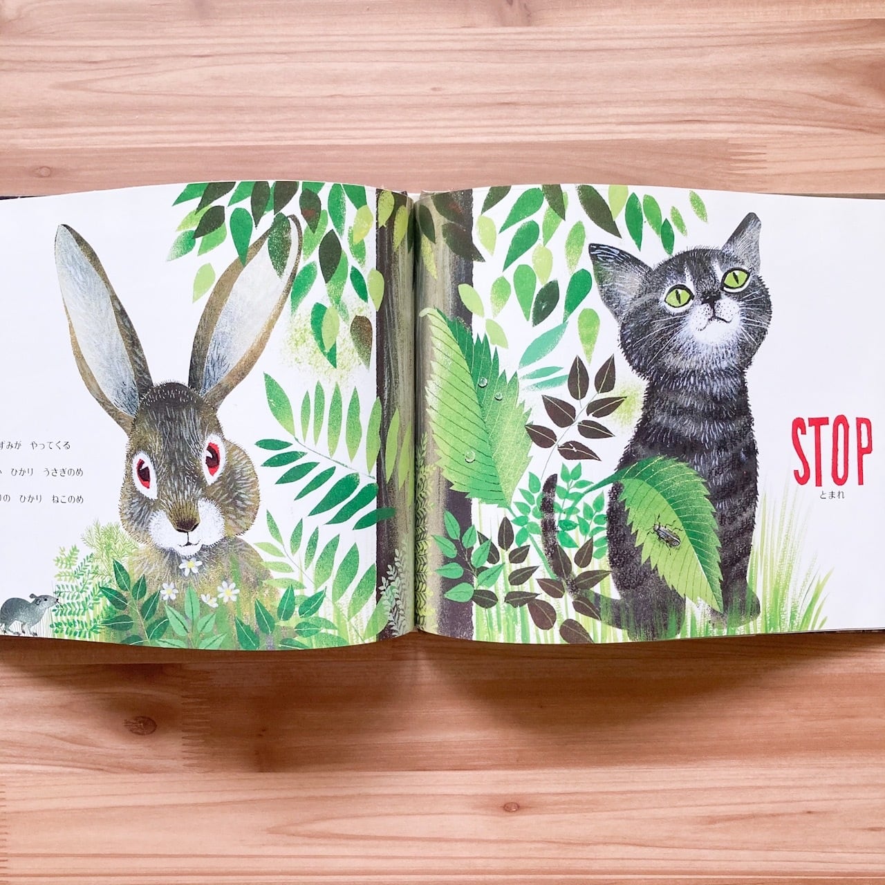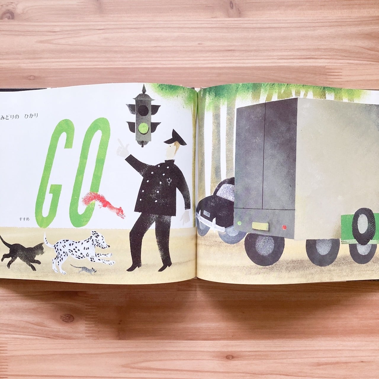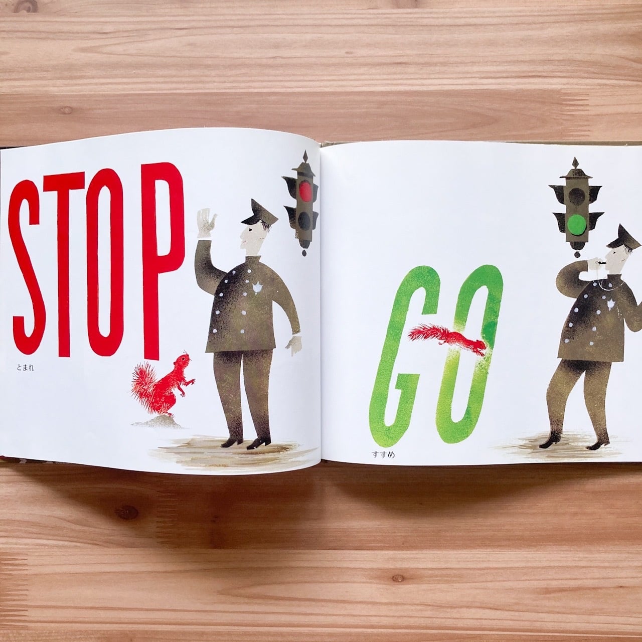 赤と緑の対比がキーのこちらの絵本は、見返しが最初は赤、最後は緑になっています。