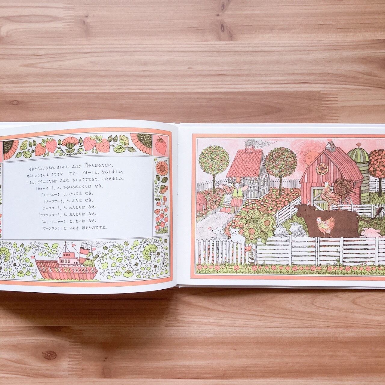 文章の周りにも細やかで装飾の可愛らしい絵が描かれています。黄緑と薄い赤の2色がメインで構成されているのですが、絶妙な色の濃淡が綺麗で多色使いしているように見えます。賑やかで楽しい農場になって幸せに暮らす夫婦が素敵な物語。