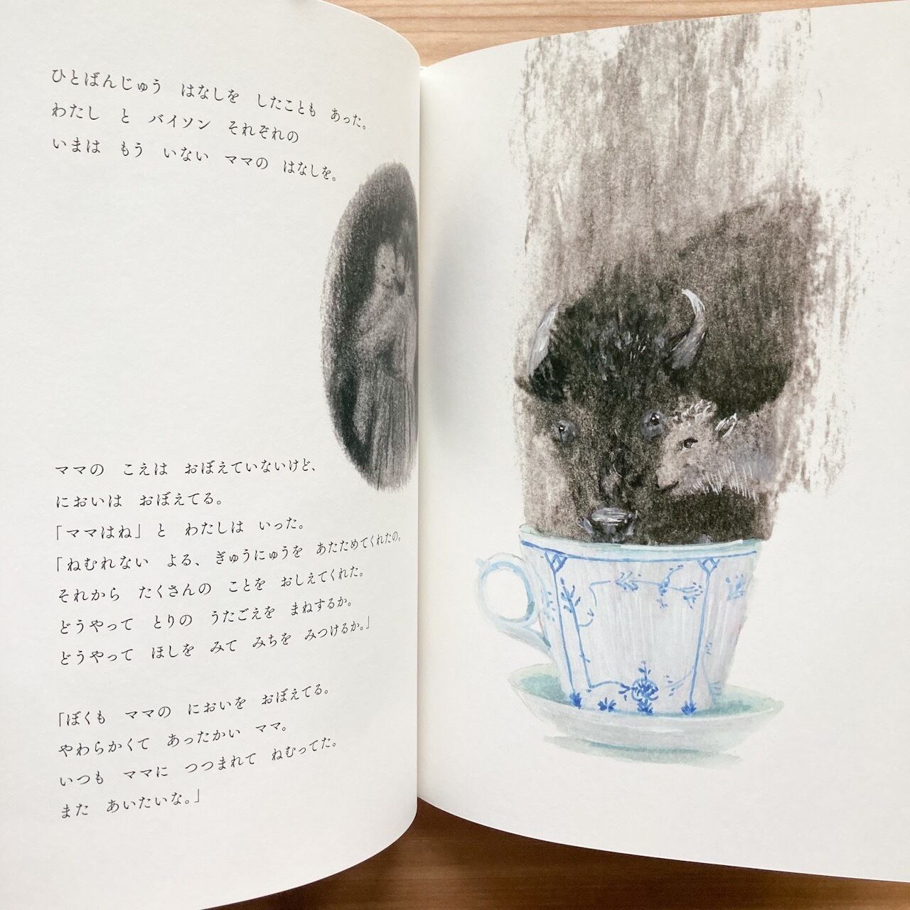 少女がバイソンに出会ったのは4歳の春の日。少しずつ心を通わせていったふたりは、それからながい時間をともに重ねていきます。いくつもの冬を越えてつづくしあわせな時間……。ですが、ある冬の雪の日、バイソンは現れませんでした。喪失と、そのあとにおとずれる心のやすらぎを優しさのなかに描いた絵本です。フランス、ル・モンド紙書評で、「このガヤ・ヴィズニウスキ初の絵本は、絵も言葉も繊細で洗練され、まぶしいばかりに美しい」と激賞。